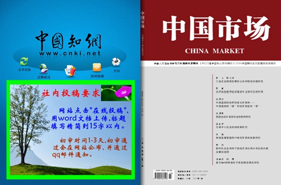 《中国市场》杂志是经国家广播电视总局批准,由中国物流与采购联合会主管、中国物流与采购联合会主办的中国大型财经、商业贸易和市场资讯类中文核心专业学术期刊。国内统一刊号:CN 11-3358/F,国际标准刊号:ISSN 1005-6432,邮发代号:82-587。主要栏目:中国模式探讨、国内智库前沿、理论研究、区域发展、经济学人、能源战略、史海回眸、智库名录等。本刊被CNKI中国期刊全文数据库、中国学术期刊综合评价数据库、中国核心期刊(遴选)数据库、万方数据——数字化期刊群等国家级数据库、中文科技期刊数据库等收录。《中国市场》杂志影响因子:0.262,被引次数:9336。